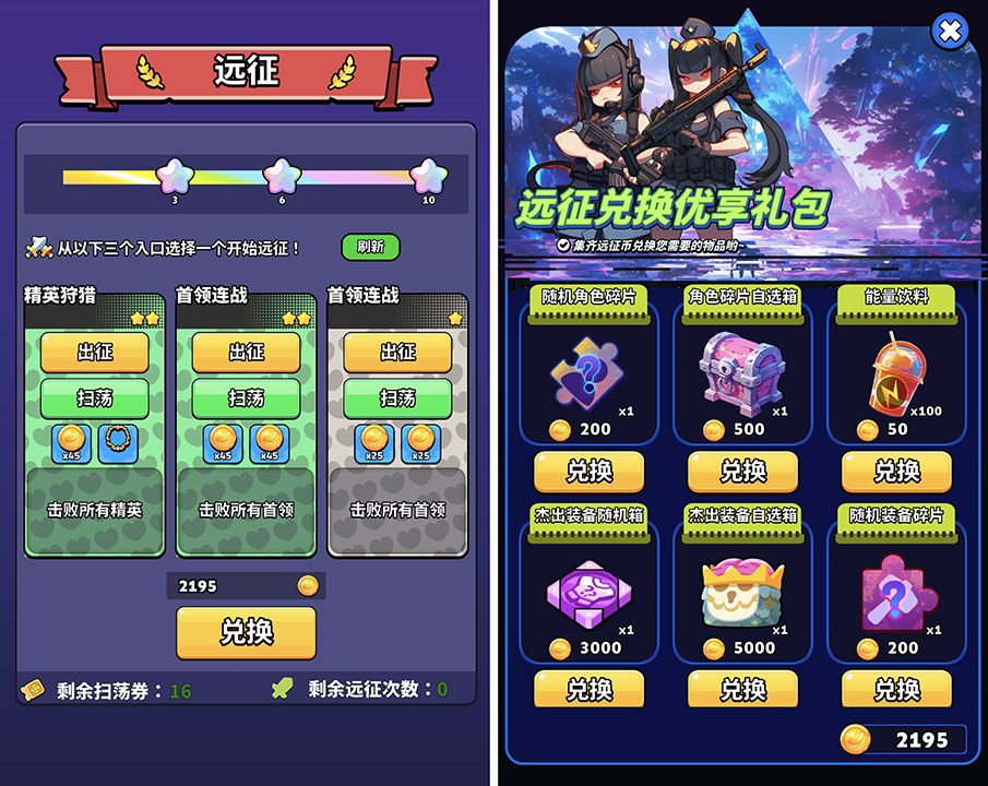 3、第六关开启远征每天也是次数打满,远征金币可以兑换角色碎片或杰出装备等材料;