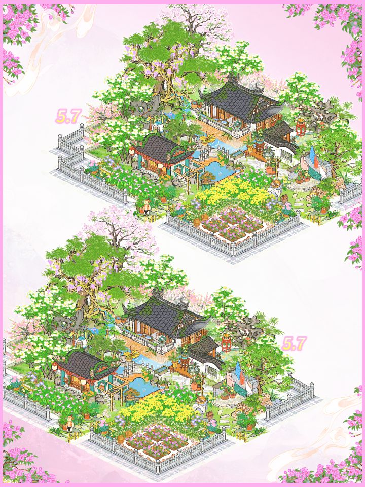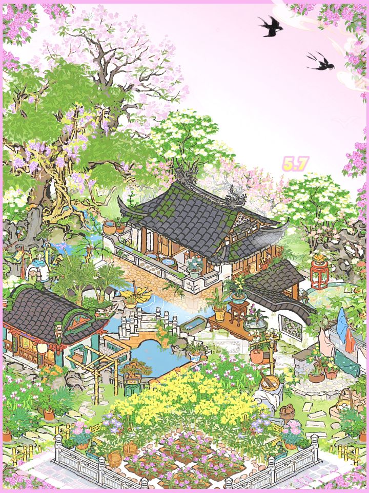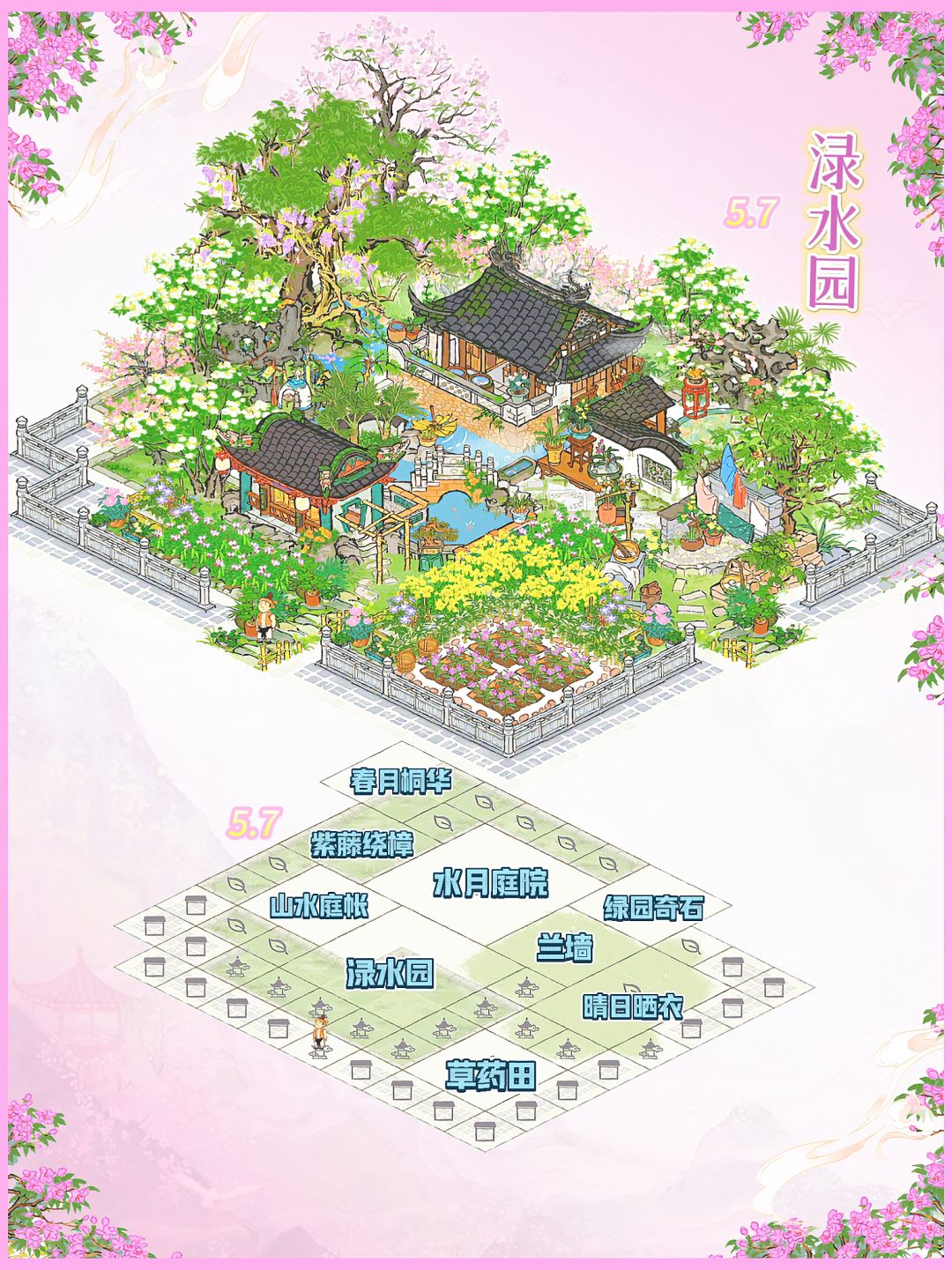 建筑:渌水园、水月庭院、山水庭帐、紫藤绕樟、春月桐华、晴日晒衣、兰墙