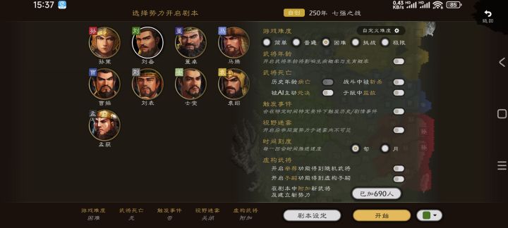 七强之战剧本,每个势力只分配了十人以内的武将,绝大部分武将都在野,主要武将太多实在没精力一个个分配了,就让他们在野吧。