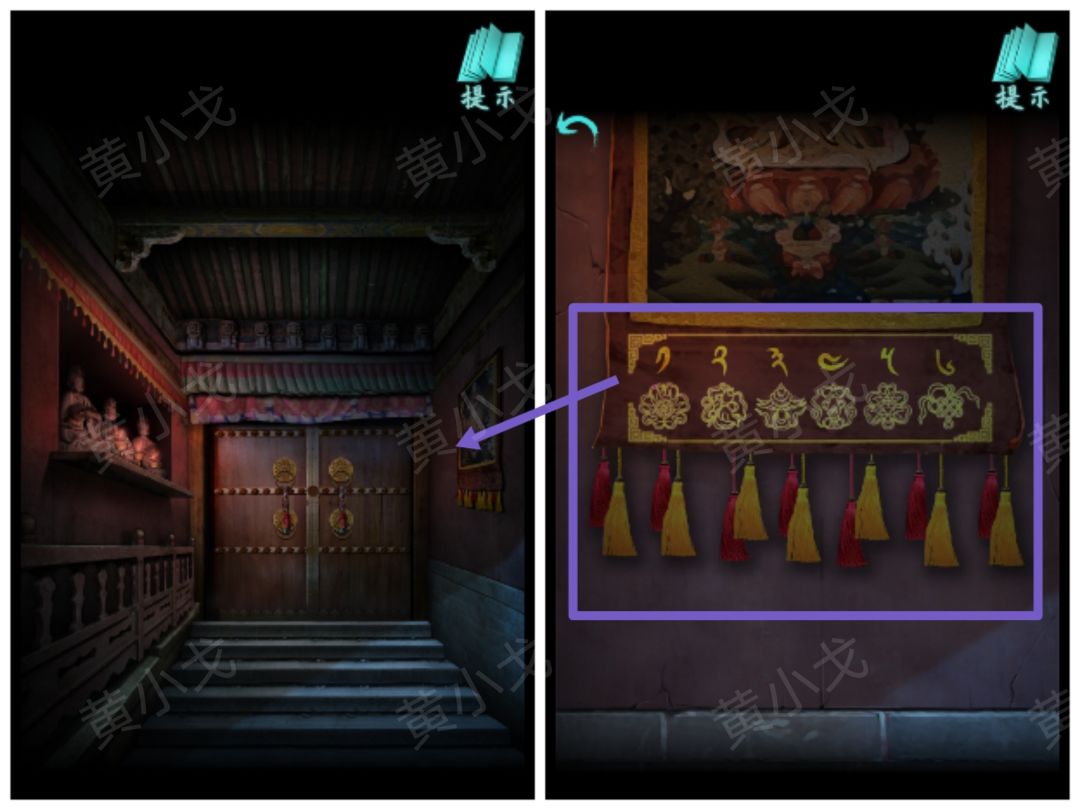 9.点击壁画前的噶当塔,根据茶杯上的符号,旋转噶当塔上的符号到对应的位置,触发机关,打开暗门