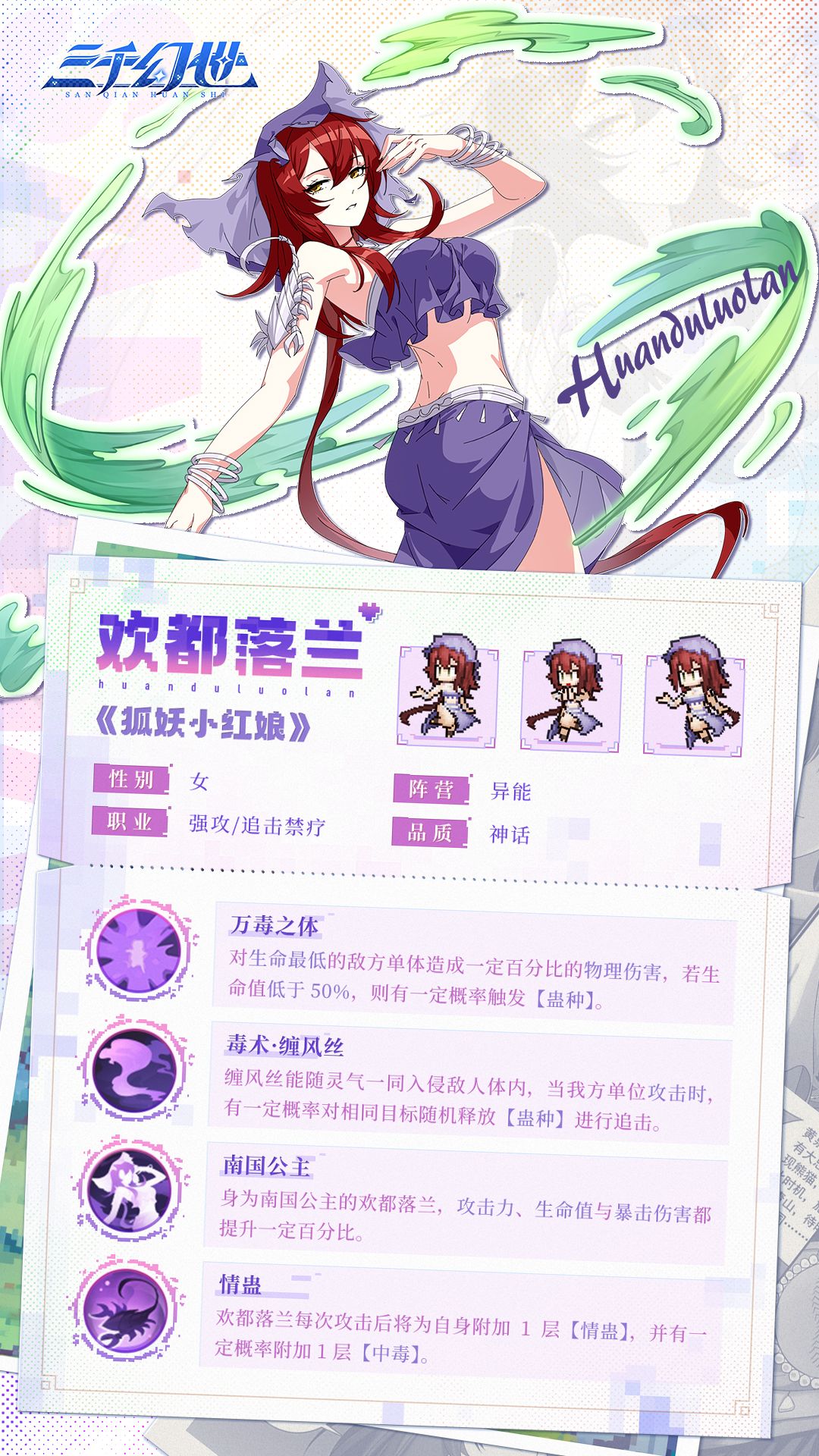 继承了父亲全部的万毒之体功力后,欢都落兰成为了南国新一代的妖皇。在《三千幻世》的战斗中,欢都落兰能够对敌方生命值最低的单体造成高额的伤害并附加【禁疗】效果,还能够为自己附加一定的增益效果。在实战中拥有强劲的实力,是作为输出上阵的不二选择。