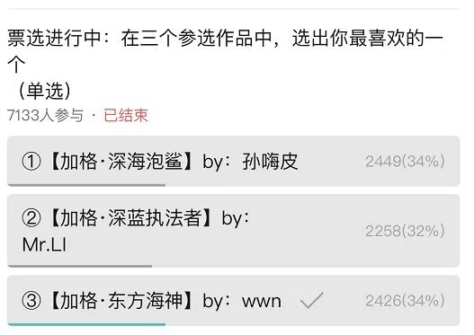 根据公开的投票结果,①【加格·深海泡鲨】和③【加格·东方海神】将进入下一步打磨阶段,美术团队将进行创意建模、细节刻画。