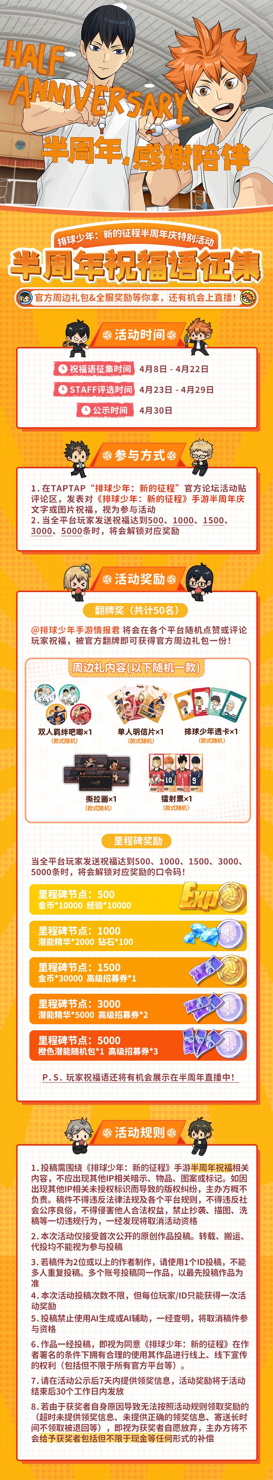 1. 在TAPTAP“排球少年:新的征程”官方论坛活动贴评论区,发表对《排球少年:新的征程》手游半周年庆文字或图片祝福,视为参与活动。