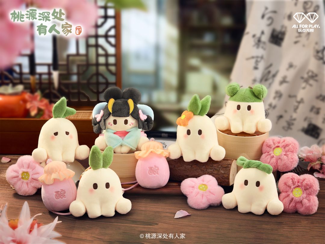 桃源食记系列蹲蹲毛绒现已开启预售!全系列共 6 款不同萌态萝萝,每盒里不仅有 1 只超软萌、能尽情 rua,还能当作挂件的萝萝本体,更搭配 1 个创意满满的毛绒配件。桃花酿能做挂饰,桃花酥可当胸针。