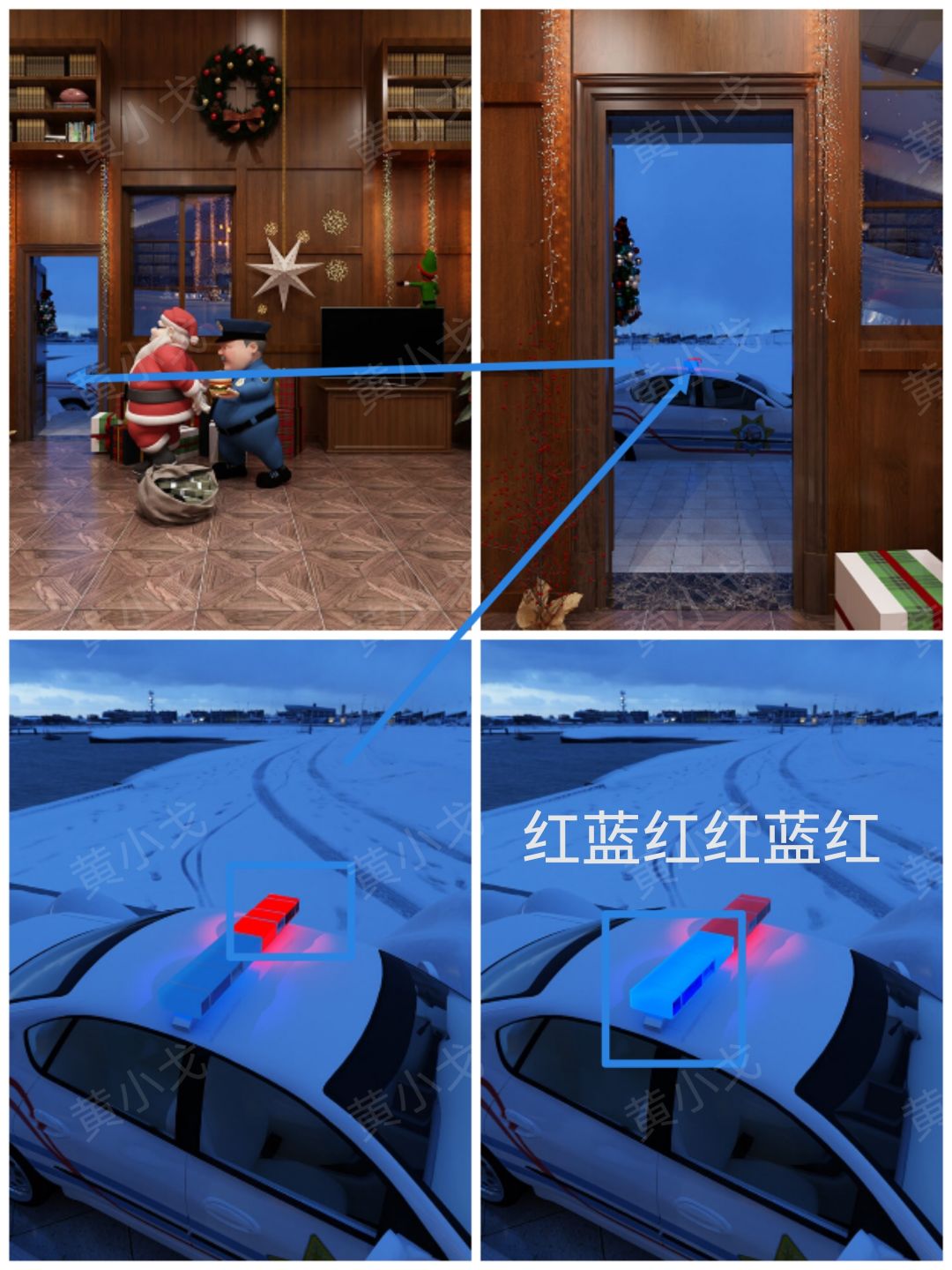 6.点击门口的警车,观察警示灯闪烁的顺序