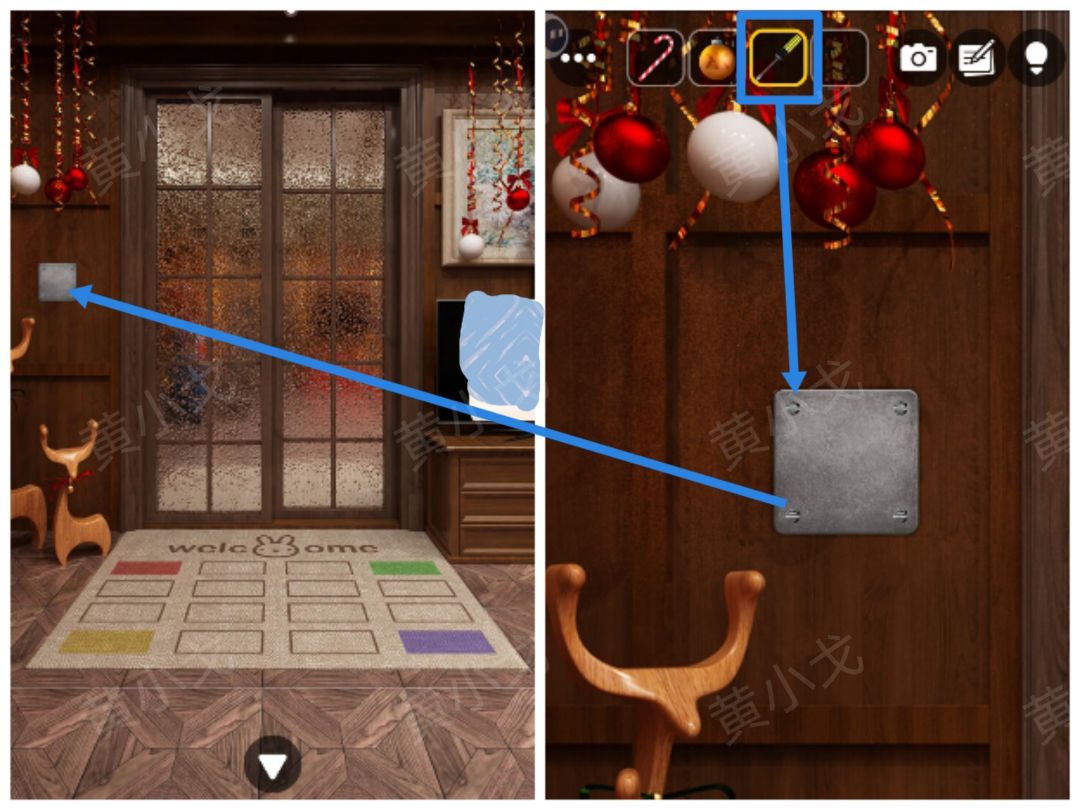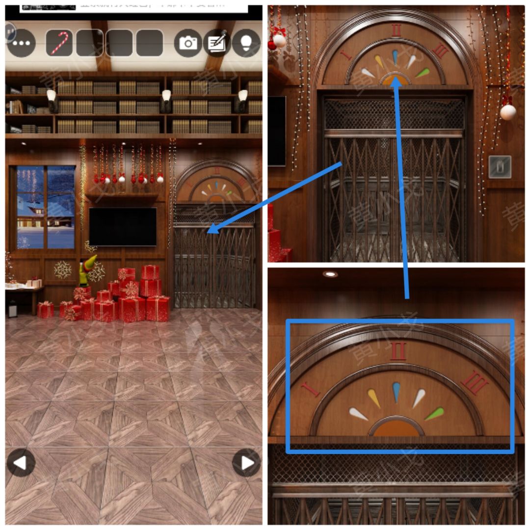 19.根据[壁炉]场景圣诞树彩灯闪烁的顺序线索,按顺序点击密码锁上的按钮,打开玻璃门