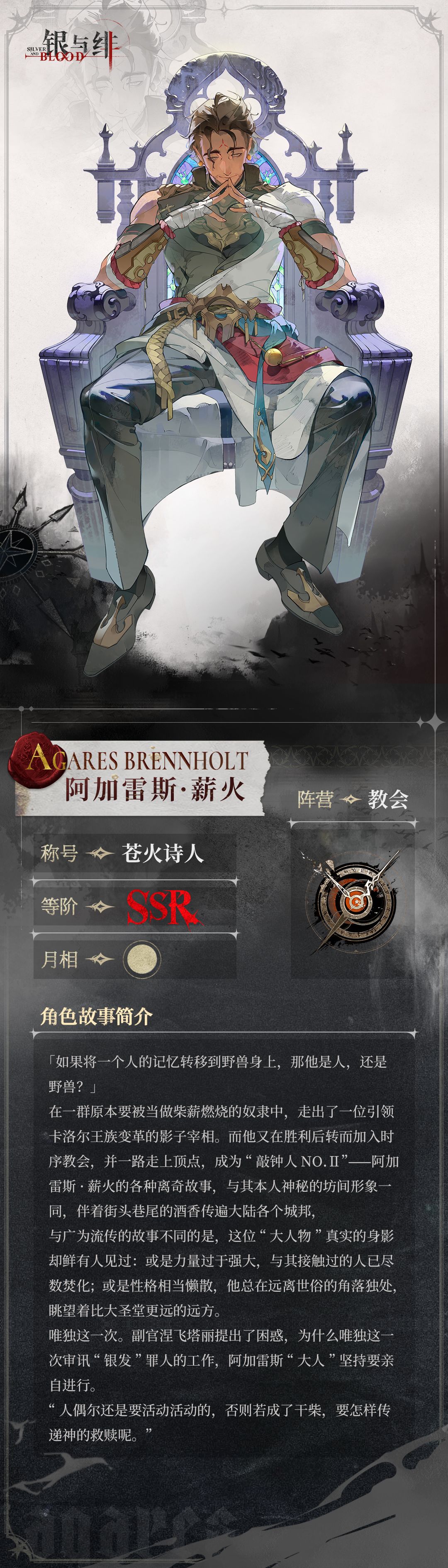 在一群原本要被当做柴薪燃烧的奴隶中,走出了一位引领卡洛尔王族变革的影子宰相。而他又在胜利后转而加入时序教会,并一路走上顶点,成为“敲钟人No.Ⅱ”——阿加雷斯·薪火的各种离奇故事,与其本人神秘的坊间形象一同,伴着街头巷尾的酒香传遍大陆各个城邦。
