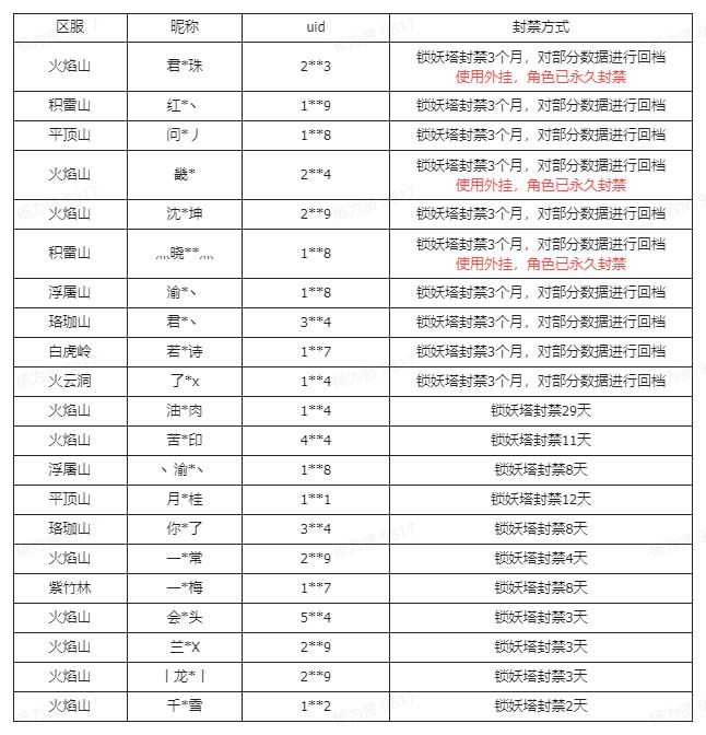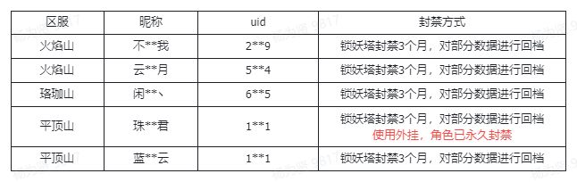 名单中的玩家会进行登录封禁进行数据处理,为期两天左右。其中,使用外挂的玩家已进行永久封禁。封禁名单如下: