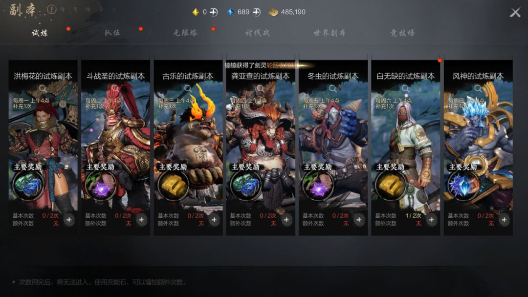 ● 试炼副本每日都会刷新,请务必将当日开启的副本全部挑战完毕!