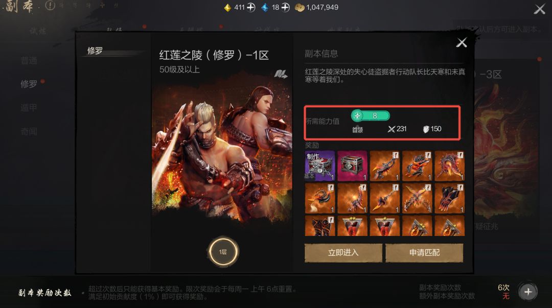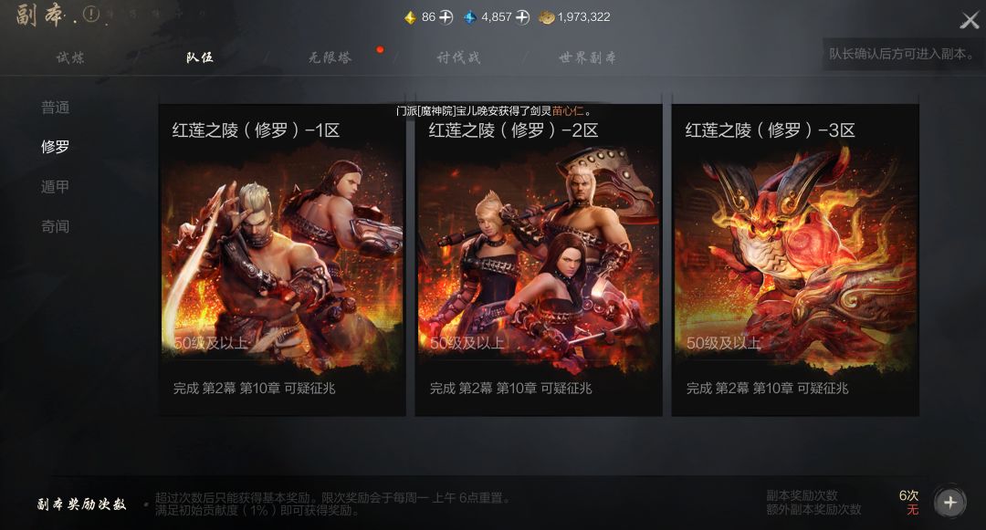 ● 修罗副本同样有每周挑战次数限制,可合理安排时间,务必在每周刷新前清空次数。
