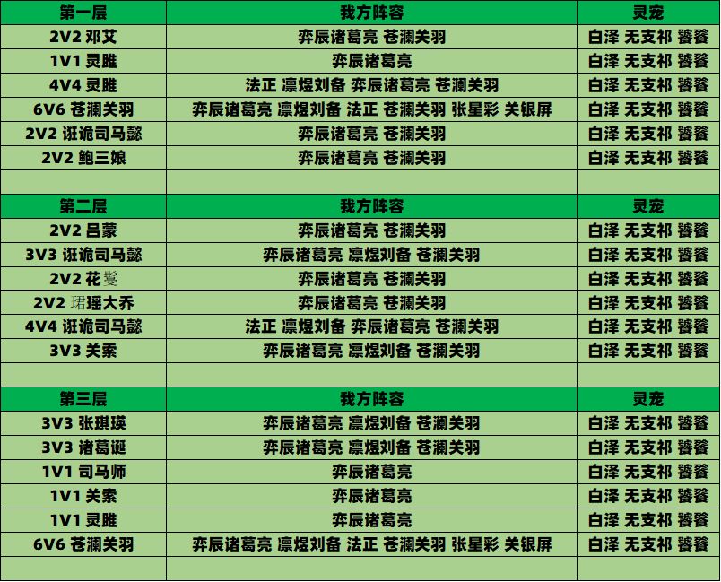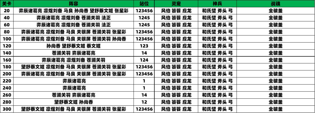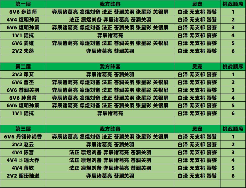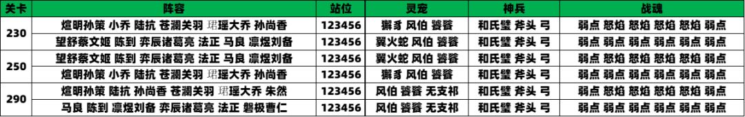 战魂:吕玲绮、蔡文姬、孙尚香、蒋钦、朱然、孙尚香、黄月英怒焰灭袭;张星彩、凛煜刘备连携加护;重溟张飞、煊明孙策、苍澜关羽、珺瑶大乔、法正、弈辰诸葛亮、曹操、磐极曹仁、昭珩陆逊弱点突袭;