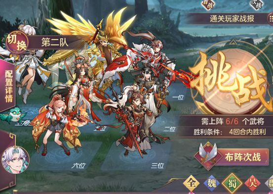 第二队:昭珩陆逊(凌统羁绊)+法正(专武+五红)+马良(专武)+弈辰诸葛亮(姜维羁绊)+凛煜刘备(赵云羁绊)+吕玲绮(专武+五红)