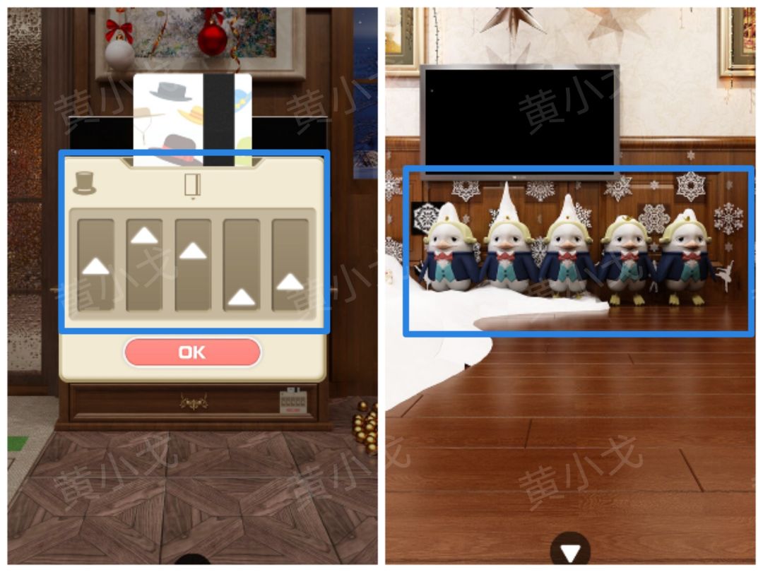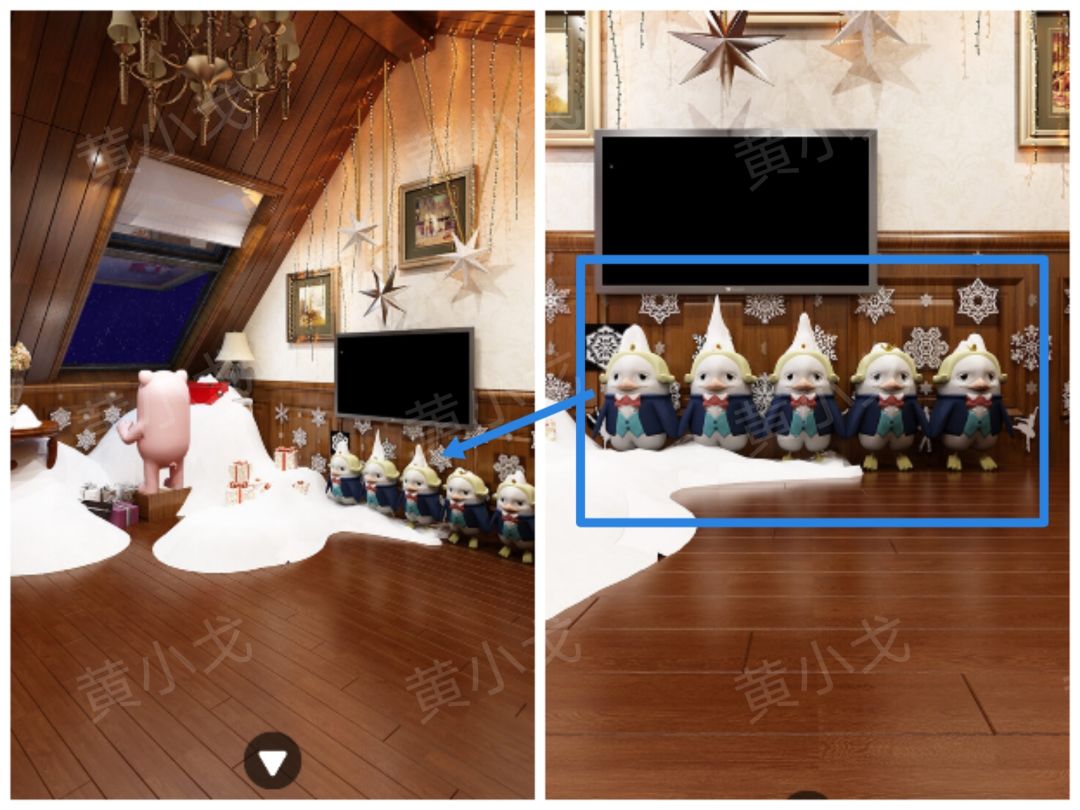 12.根据[阁楼]场景企鹅头顶的雪堆高度线索,调整密码锁