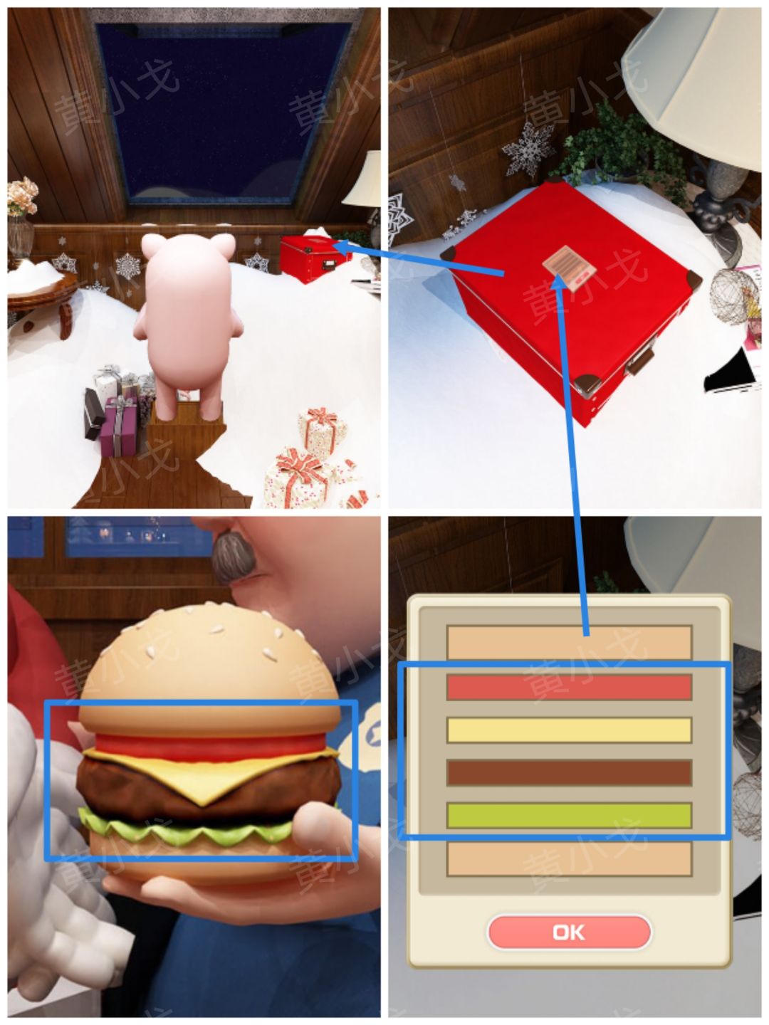 4.点击桌子上的红色盒子,根据[正门]场景警官手上的汉堡包线索,调整密码锁