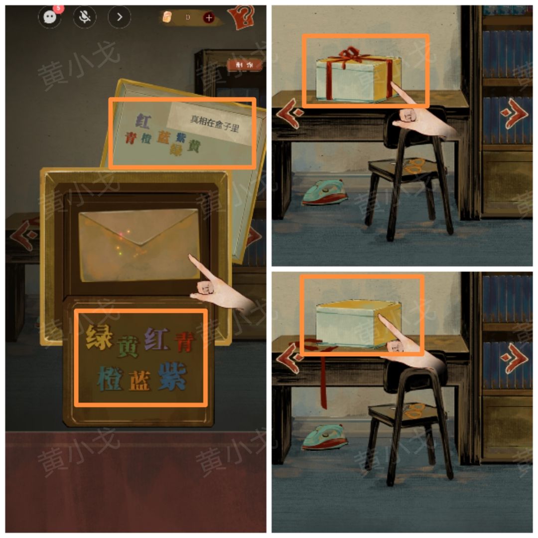 1.点击打开桌子上的盒子,根据盒盖上的线索,调整字的颜色;拿出信封✉️