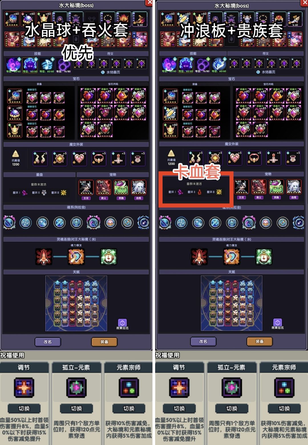 ※使用冲浪板+贵族套+卡血可以参考上期卡血视频,若不卡血,则技能元素之智换回赞美诗,星盘血星环换回狼星环