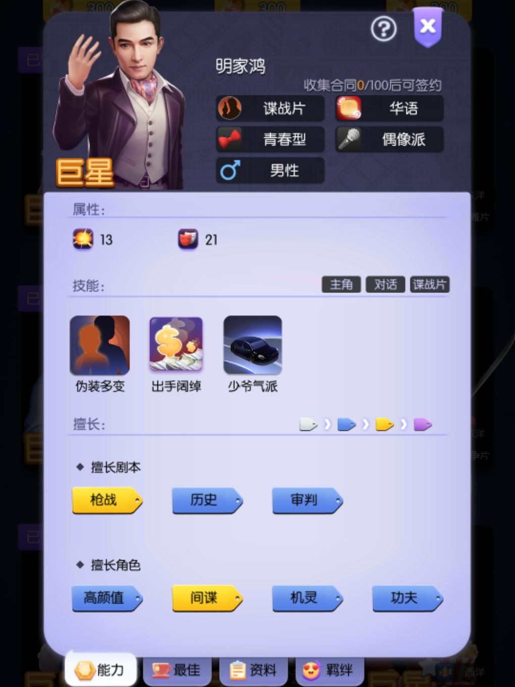 谍战目前我已经拥有的巨星角色为:王星辰,奥波尼亚,洛克萨斯。