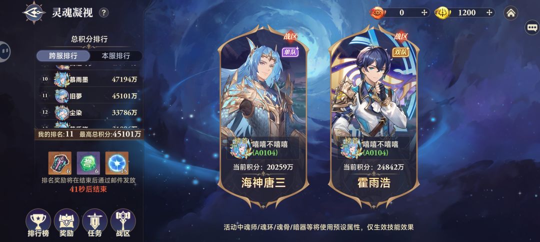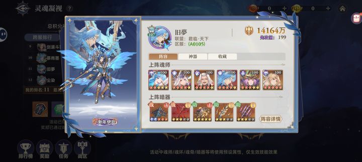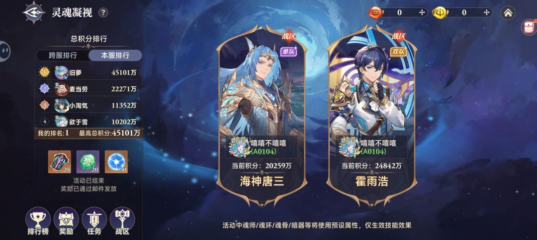 来看看这期平民微氪玩家的收获吧。这期霍雨浩活动提升了差不多两三千万战力,霍雨浩升到了四星。武魂水晶800抽抽到了13个也不是全保底,抽了上期800抽和这期的也是成功白嫖到十万年魂环了。这次霍雨浩秘境冲榜活动拿下了跨服第11名和本服第1,跨服差一点伤害就能拿前十奖励有点可惜。这期又换了一套时空魂骨暗魔邪神虎,提升还是可以的。