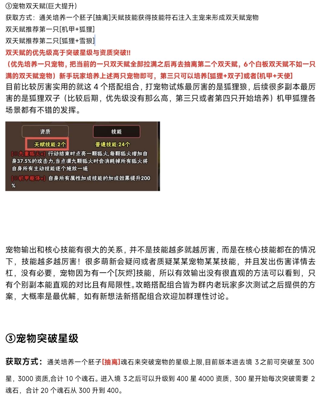 宠物合成的底层逻辑没有变动,根据现版本情况修改了添加了一些内容,主要是发给刚接触宠物的萌新看的,文字内容过多放出来内容截图了,宠物相对比较重要的几个技能都在表里了,在有以上技能的基础前提下,多多益善。