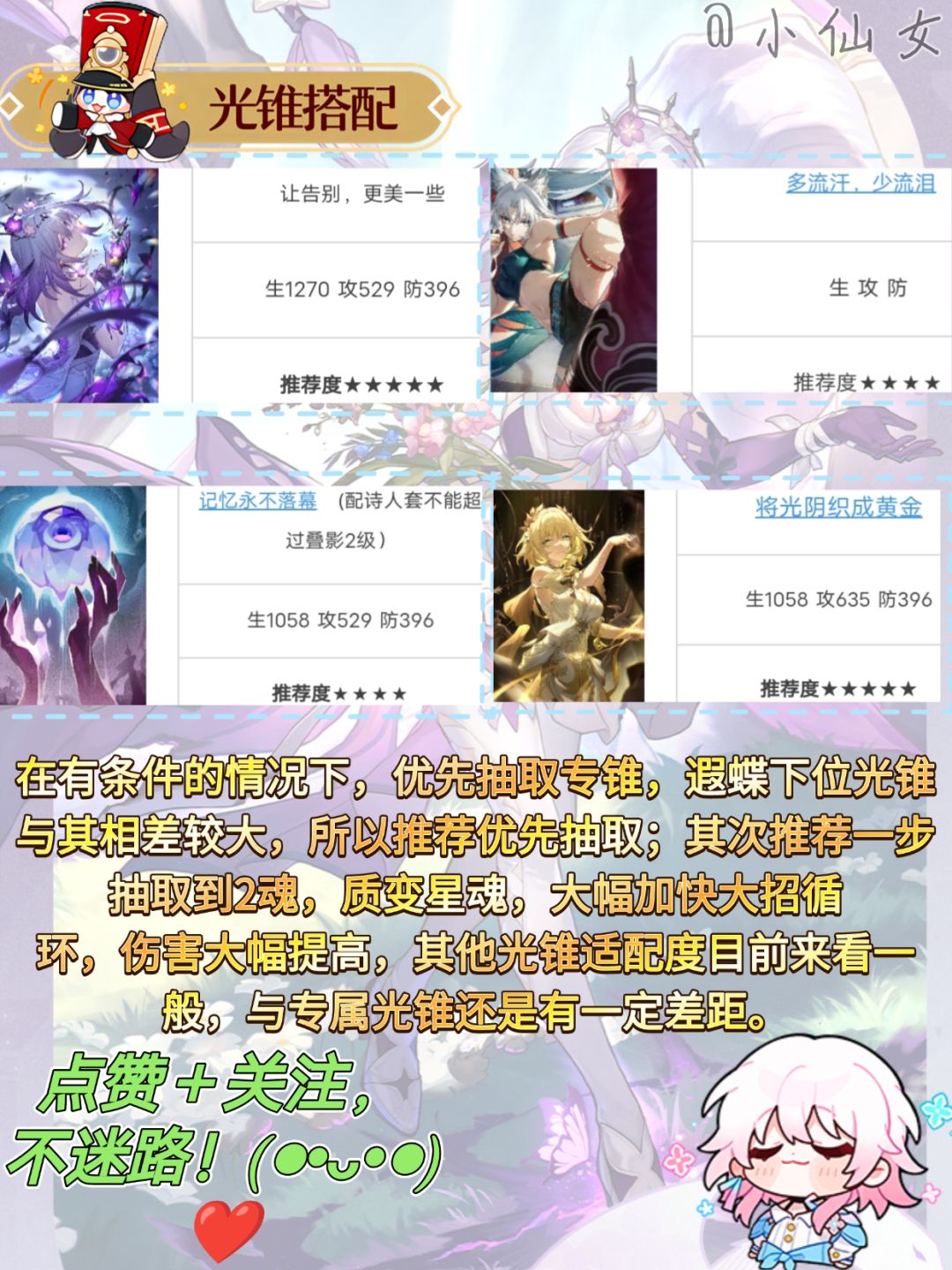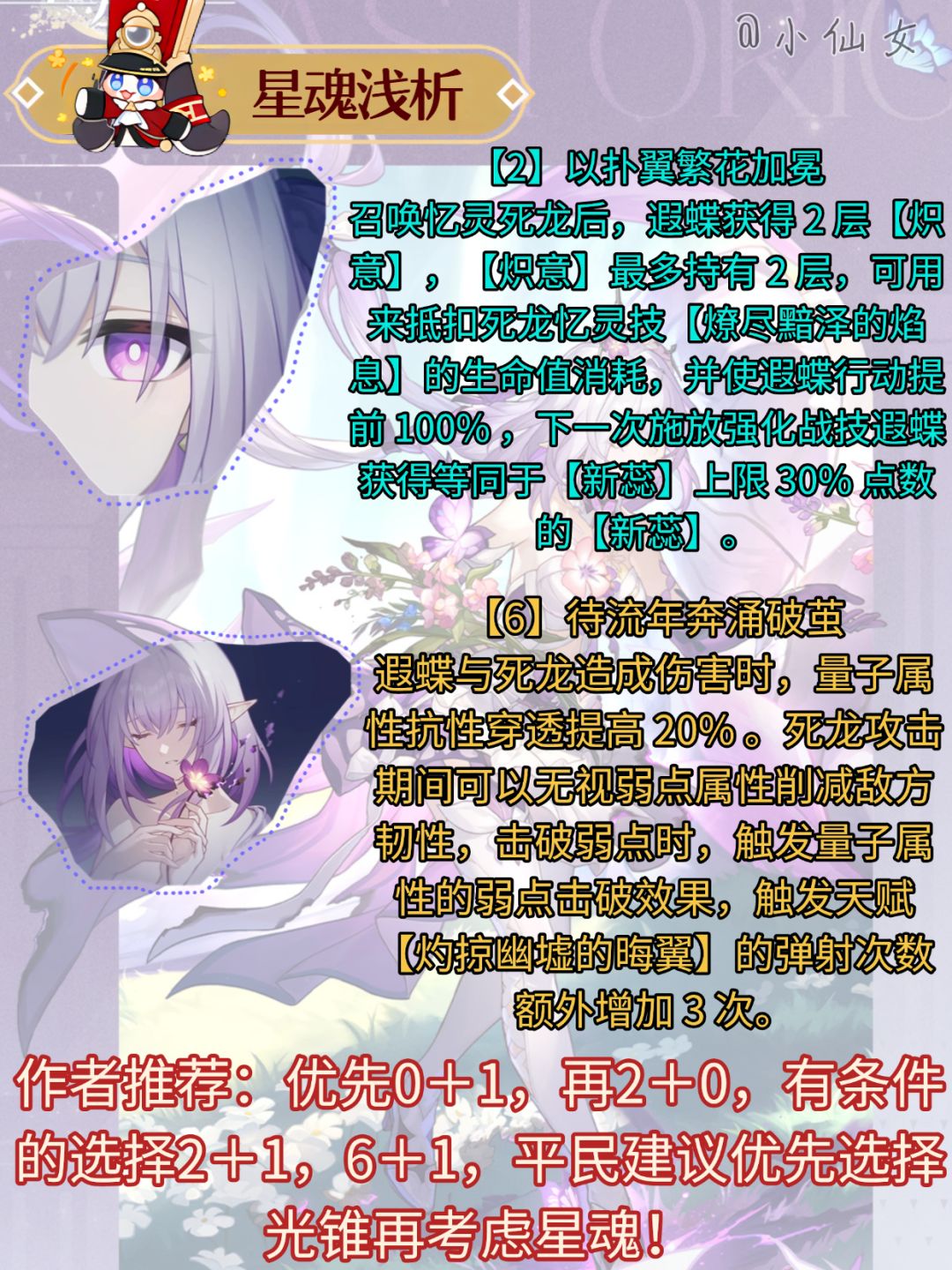 <遐蝶>作为记忆命途的生命大C,在3.x版本具有较高的抽取价值,同时也非常推荐有条件的玩家直接 2+1 毕业,角色在特效/ 强度上都有保证,在战斗环境上也可以享受较高的适配度,另一方面,由于是生命体系主 C,和常规的攻击力辅助适配度较低,已经抽取培养了<缇宝>的开拓者会有更好的体验。#崩坏星穹铁道2周年 #崩坏星穹铁道创作者激励计划 #崩坏星穹铁道 #崩坏星穹铁道攻略 #走过安眠地的花丛 #走过安眠地的花丛打卡