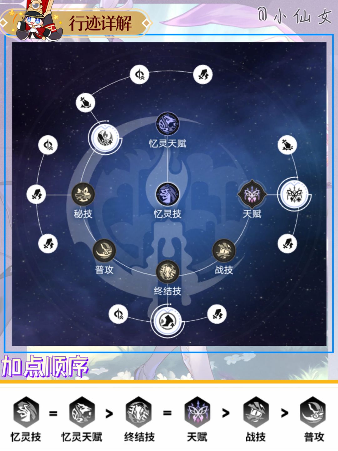 ①周年庆版本的主推大C,秘技和战斗特效拉满,也是3.X版本"记忆命途+生命体系"的核心输出角色,可以同时兼顾对单/对群,额外还带有独特的场外背包技"月茧之庇",让队友"免死"1次,抽取0+0即可生效!