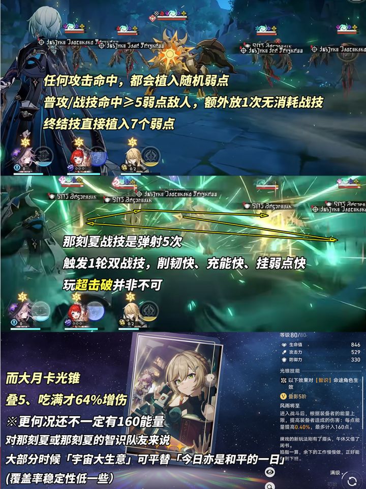 那刻夏天赋效果,攻击每次命中都会敌方添加1个随机弱点;普攻或战技命中弱点≥5的敌人时,额外追加1次战技(不消耗战技点且也能挂弱点);终结技则是立即为敌方全体添加‘火、水、冰、雷、物理、量子、虚数’7个弱点。