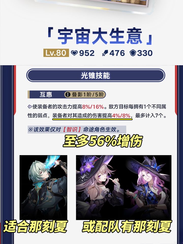 因此,当那刻夏处于你队伍中,敌方BOSS、精英怪头上的弱点直接帮你拉满了,光锥「宇宙大生意」的56%增伤覆盖率极高。也许你对这没太多概念,叠5「今日亦是和平的一日」大月卡光锥角色能量*0.4%增伤(至多计入160能量64%增伤)。对那刻夏来说,此活动光锥基本等价于大月卡光锥~