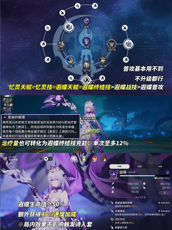 ③实战中需尽可能确保遐蝶血量健康,并非担心翻车(死龙会救你),而是影响增益触发!额外能力「倒置的火炬」,遐蝶血量大于等于50%时,遐蝶速度提升40%。为吃满遗器无奈低速流,这速度加成至关重要(局内效果不影响触发诗人套)!
