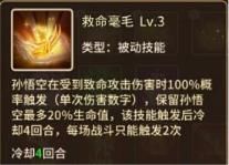 孙悟空受到致命伤害时会至多保留20%生命。该效果触发后进入四回合的CD,每场战斗可以触发两次。