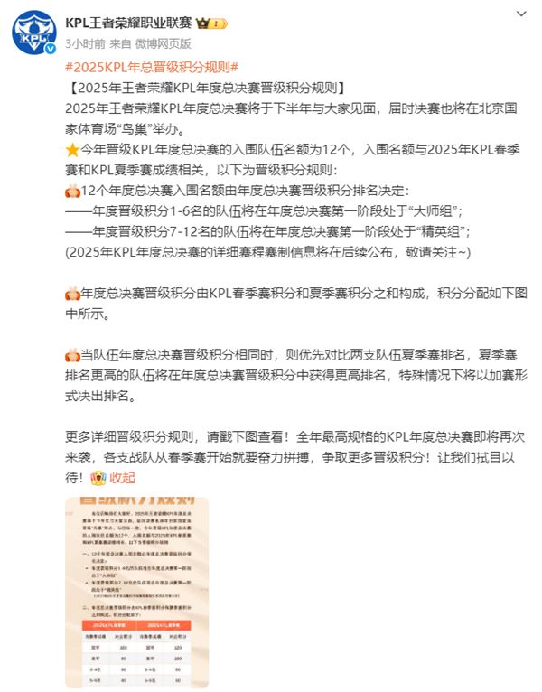 今年晋级KPL年度总决赛的入围队伍名额为12个,入围名额与2025年KPL春季赛和KPL夏季赛成绩相关,以下为晋级积分规则: