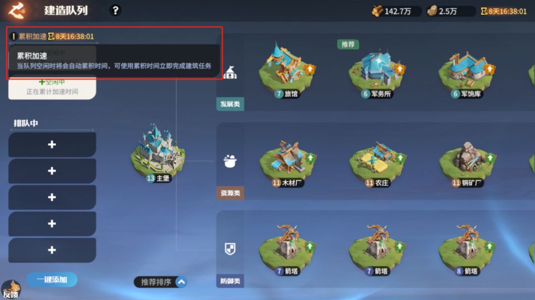 当队列空闲时将会自动累积时间,可使用累积时间立即完成建筑任务,所以说每个玩家的加速时间是相同的!