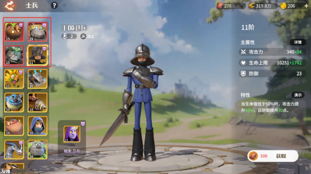 这三个兵种是在中期最有用的兵种;巨力橡果、刚毅石人常规配队,丧气泥人护卫属性可防止刺客切入