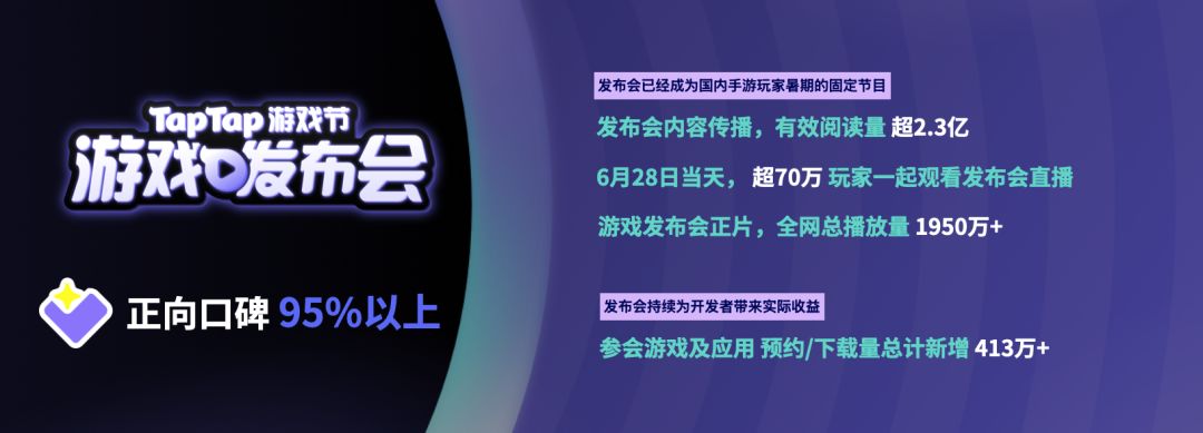 作为 TapTap 暑期核心品牌活动 “TapTap 游戏节”的重磅环节, TapTap 游戏发布会以 “最懂玩家的发布会” 为宗旨,在 2024 年创下 2.3 亿有效阅读、 1950 万次视频播放及 400 万预约增长的佳绩。TapTap 游戏发布会连续两届专设“聚光灯计划”板块,为优秀的独立游戏提供专门曝光。如果你的游戏有曝光需求,欢迎通过下方通道报名。