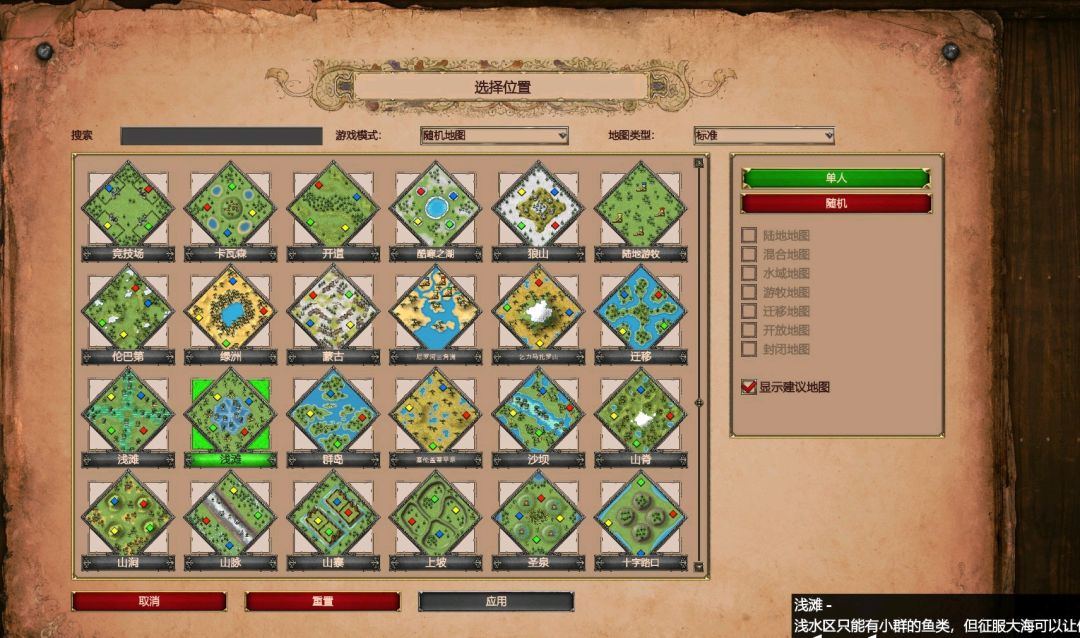 看来每一张地图都有他存在的意义的,存在即合理。玩腻了千篇一律的阿拉伯和竞技场,换了一张完全陌生的地图,感觉还真不一样。发展、扩张和打法都有些许不一样,每局玩都能有不同的感觉,还有很多的玩家自制随机地图。——只是还是不太适应有海的地图。