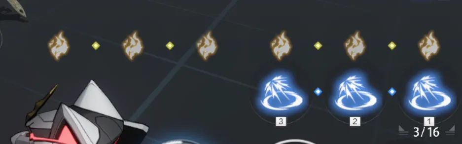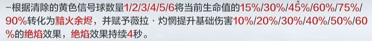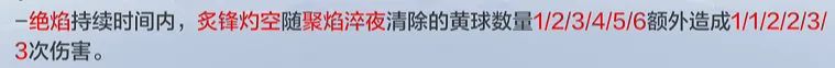 黄球无需操作,在释放一段大时自动消耗,根据消耗掉的数量决定“绝焰”buff的增伤数值。