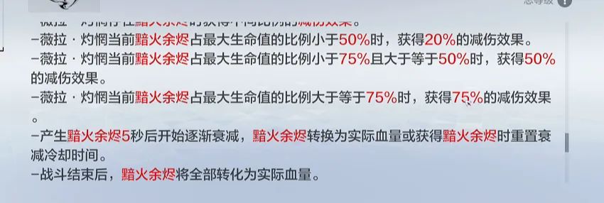 在薇拉的小作文介绍中,有一个词出现的极为频繁——“黯火余烬”,其实就是一种特殊的烧血状态,在开启一段大时会烧掉一定的血量并转化为黯火余烬状态,烧血后可获得减伤效果。