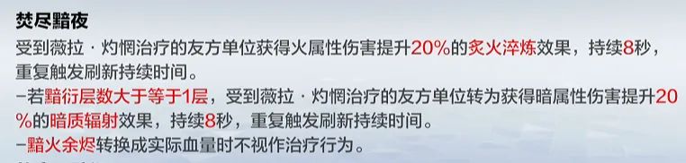薇拉在治疗时就可以触发炙火淬炼(常用的治疗方法有红球、核心长普、qte),获得火属性伤害提升的增伤效果。如果黯衍效应层数≥1层,则转而获得暗属性伤害提升效果。