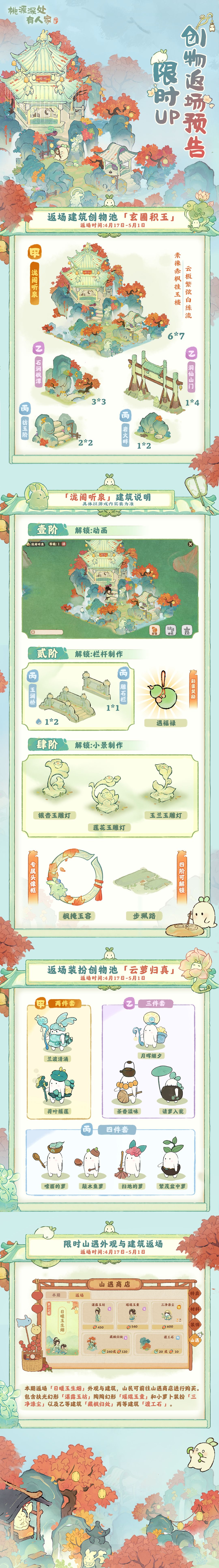 各位萝萝山的山民好呀!「玄圃积玉」建筑创物池、「云萝归真」装扮创物池以及「日暖玉生烟」山遇,即将于4月17日上午10点返场,感兴趣的山民千万不要错过萝!