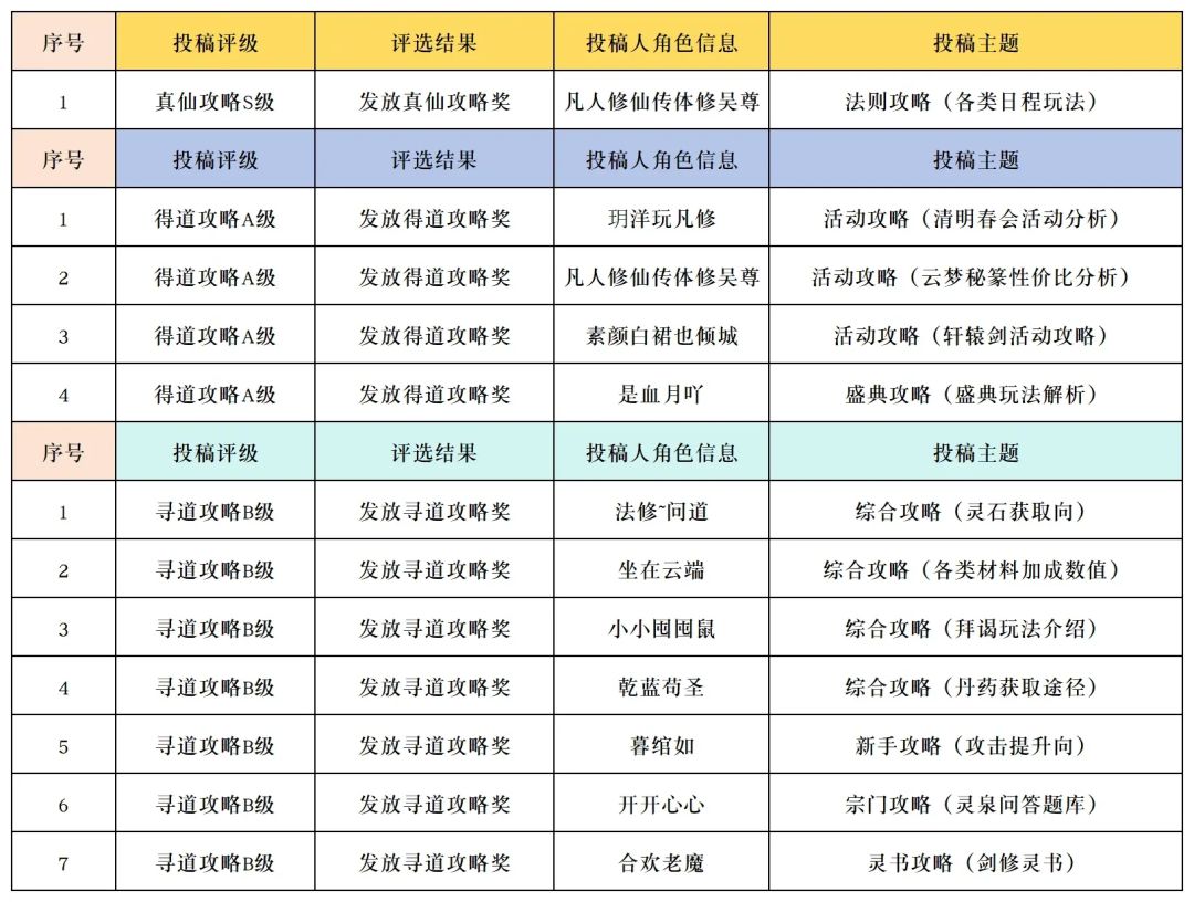 2. 真仙、得道、寻道攻略的奖励将于入选名单公布后的7个工作日内发放,请道友耐心等待。按照问卷星后台角色填答记录发奖(换角色请评论区留言),若发奖时不属于游戏活跃玩家(7天内未登录)则不符合发奖资格。