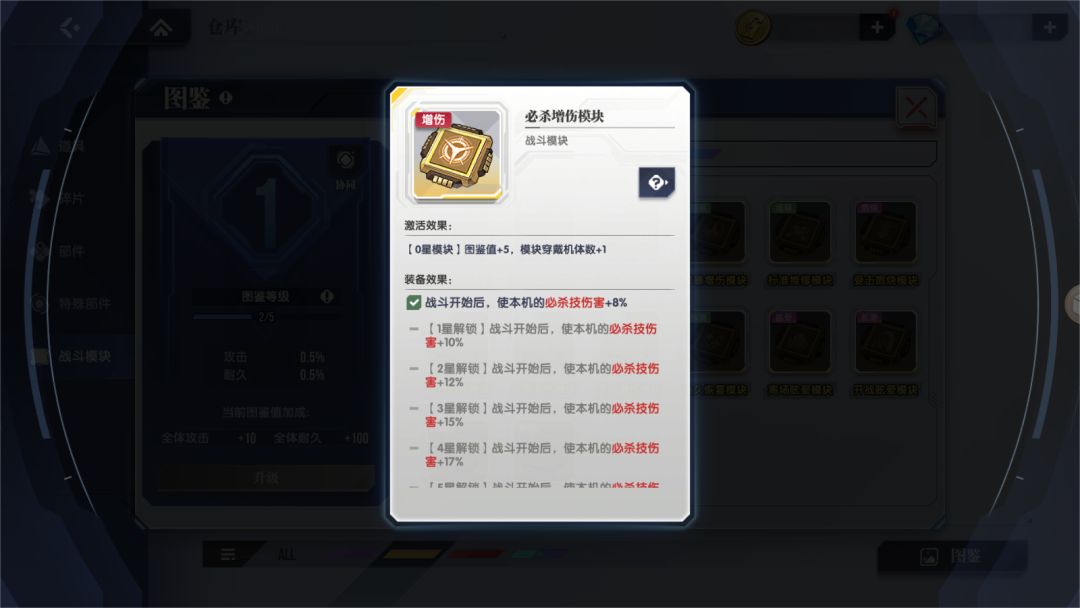 技能效果:装备了完美背包的强袭高达性能攻击能力大幅提升,本机的暴击率提升35%,暴击伤害提升50%,攻击提升15%。