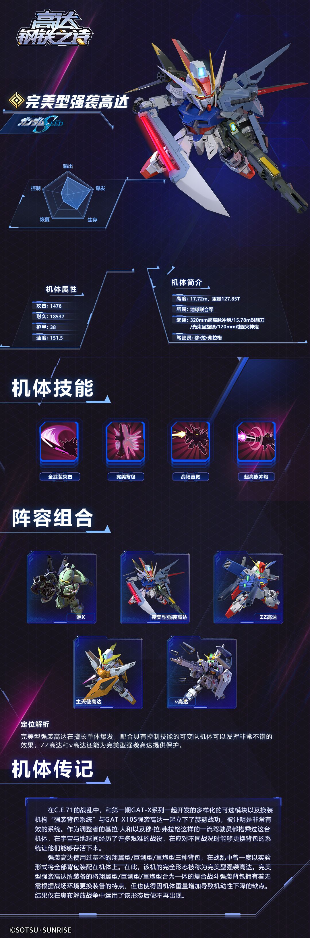 总体而言完美型强袭高达是一台在单体爆发上做到极致的机体,一旦敌方有机体耐久度为0就能让其提升速度和能量,依靠连续发动能够造成高额无视护甲伤害的必杀技打开局面。但其本体由于没有能提升生存能力的被动技能,因此需要其他机体的配合和保护,只要能保证它的生存,完美型强袭高达将会是敌人的噩梦。