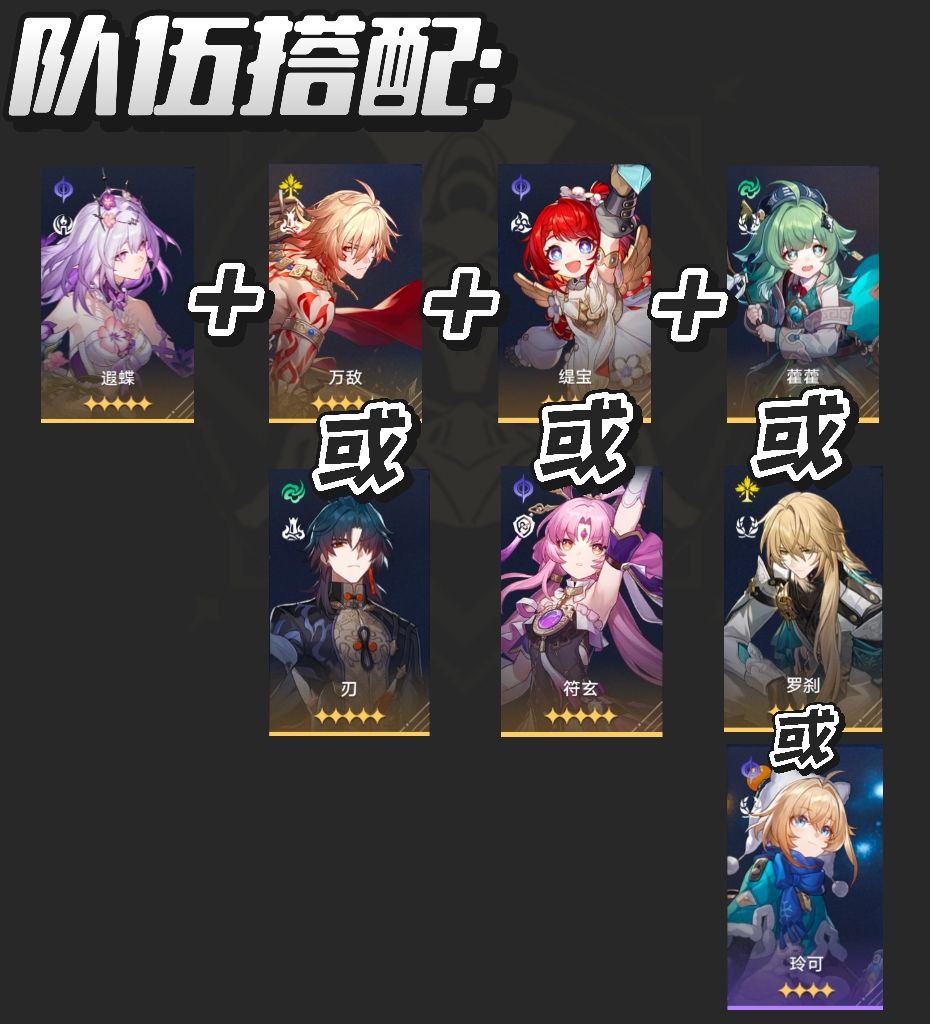 【遐蝶】在输出过程中会消耗队友的血量转化为死龙的输出资源/重生进程,因此,需要烧血的生命倍率角色【万敌】和【刃】就可以作为遐蝶的队友,他们的高生命值消耗起来还能提供更多的死龙充能,以此来构建双C体系。生存位优先选择溢出治疗量的【罗刹】,;其次选择【藿藿】/【符玄】;【玲可】和【加拉赫】则是平民最优解。辅助位优先选择【缇宝】,缇宝能提供团队生命值。
