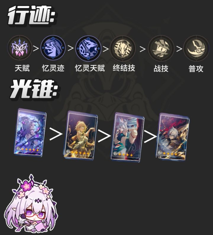 行迹:天赋>忆灵技>忆灵天赋>终结技>战技>普攻