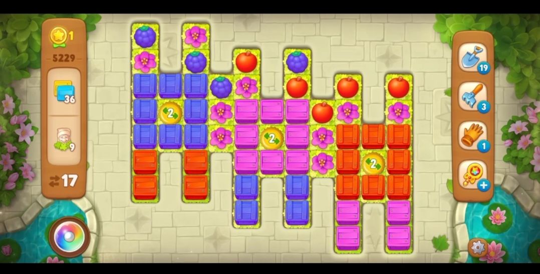 根据剧情方向走,先消除中间粉色箱子获取一个瓶盖(+2步),当你开始着手消除时,随便移动几个元素就会很容易自然形成加速道具,不知道是运气好还是本关设定的潜在规律。不管是哪一种情况,先连锁爆破再说,选择一个你认为需要第一时间爆破的方向,以获取更多移动空间。