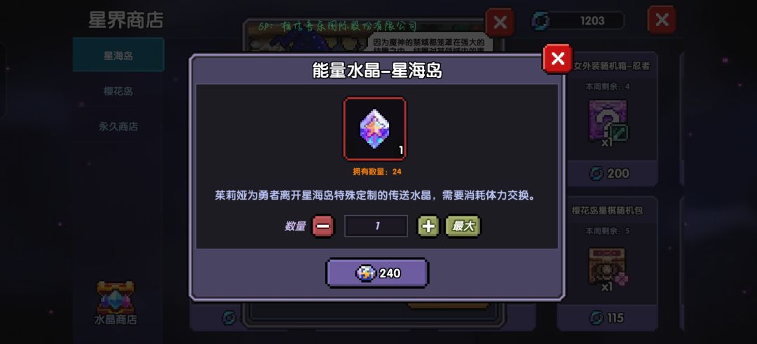体力消耗480点:每周我们需要打两次星海岛,体力只需要换星海岛水晶即可,樱花岛纯纯和他不熟所以萌新勇者们尽可能的别换(主要是收益太低了)