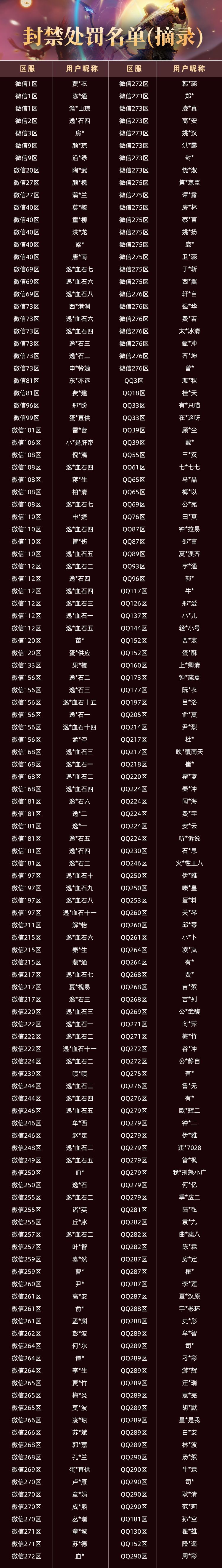 经统计,三月累计封号处罚账号8810个,其中240个账号已被采取全区封禁十年的顶格处罚(含“坐挂车”,瞬移,雷达等违规行为账号),以下为三月经官方核实后给予封禁十年处罚的账号信息(部分摘录):