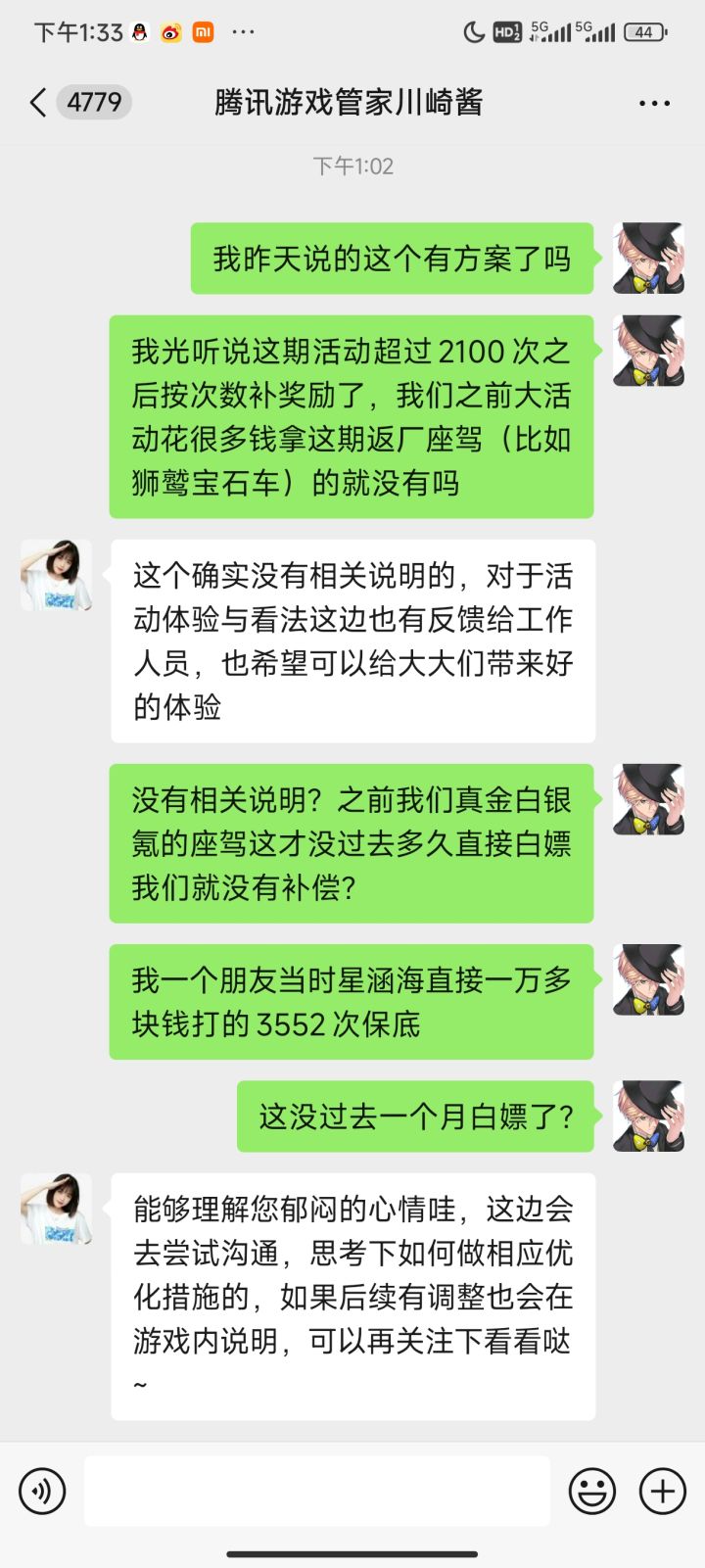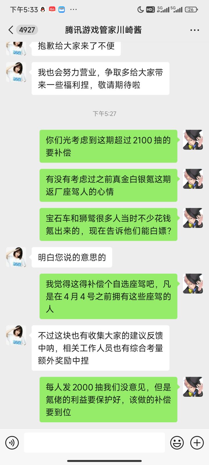 开服的五年老玩家了,在这游戏上花了快20w,从来没有对这个游戏这么恶心过,我只能说,龙族快死吧。之前花那么多钱氪的宝石车现在白嫖,还没有任何补偿。开那么多天灯没有一个座驾或者红瓶子,出的全是垃圾时装,还得花钱倒,倒来钻石一个子花不出去,买啥全是返钻。真不知道还充啥钱,现在上个线都恶心