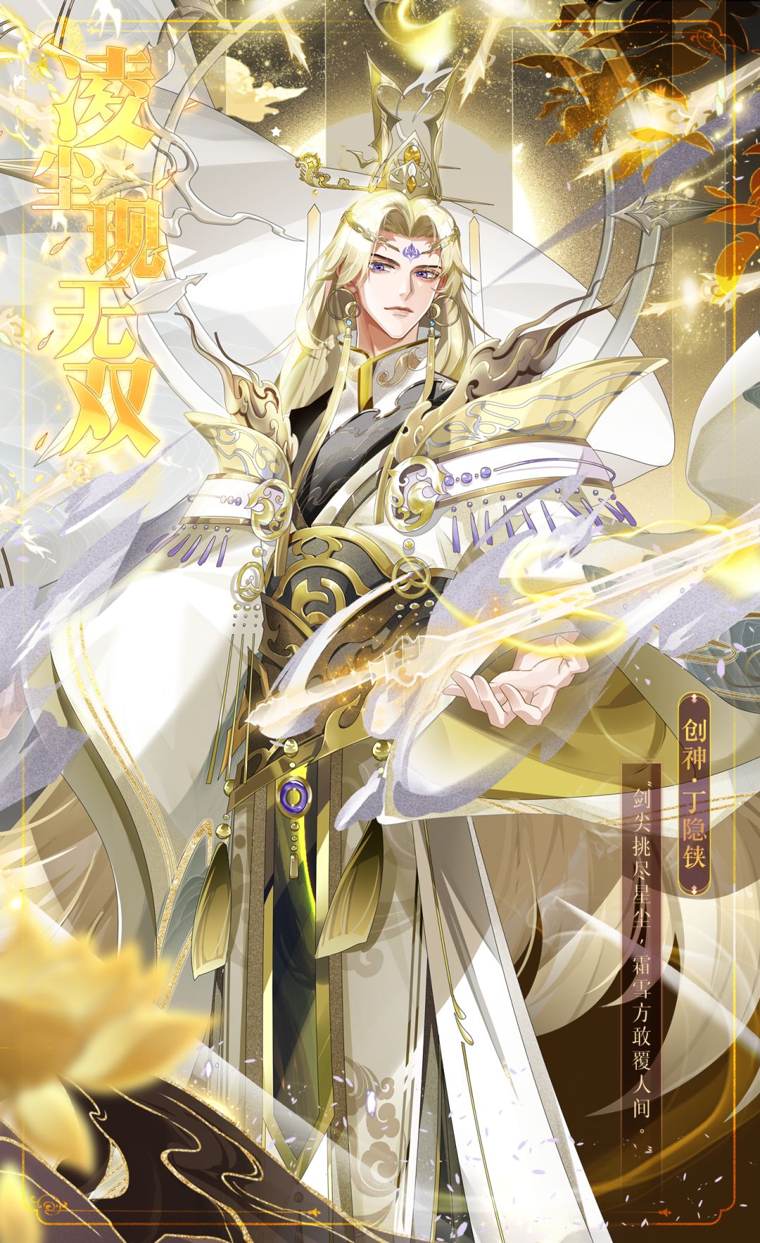 金冠坠影裂流云,剑指凝霜挑星尘。披风燎燃的岂是风,是神祇垂首间坠落的碎月,环刃悬剑更将浮生悲欢拦腰斩断。这通身雪色原是天外最冷的焰,偏生睫上金箔颤落,又缠绕了三分烫穿轮回的妄念。