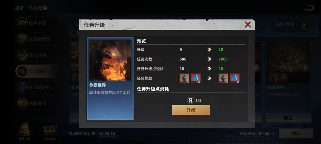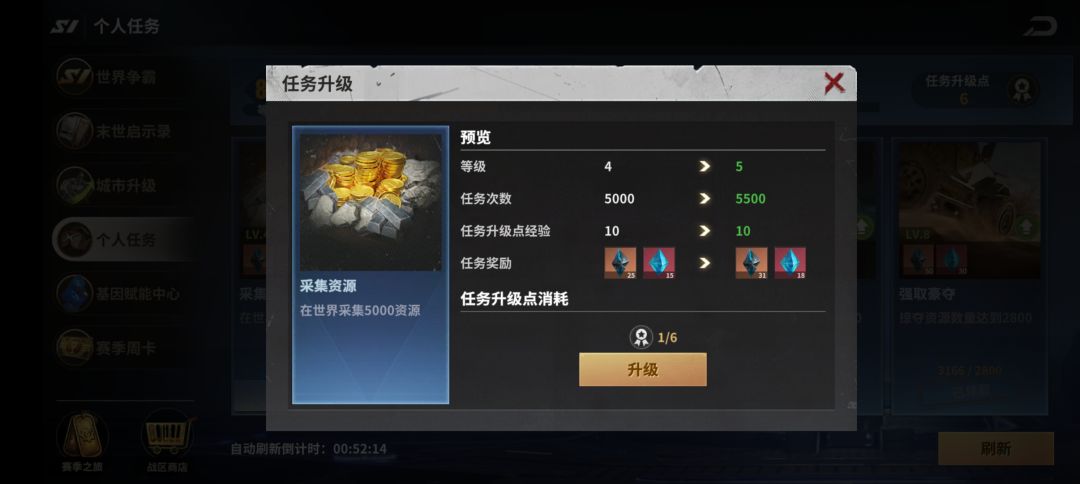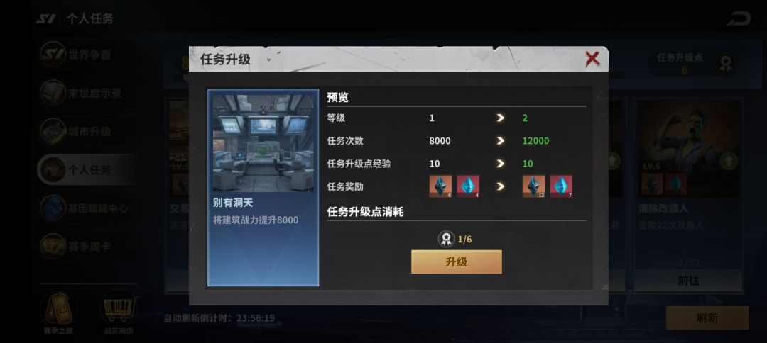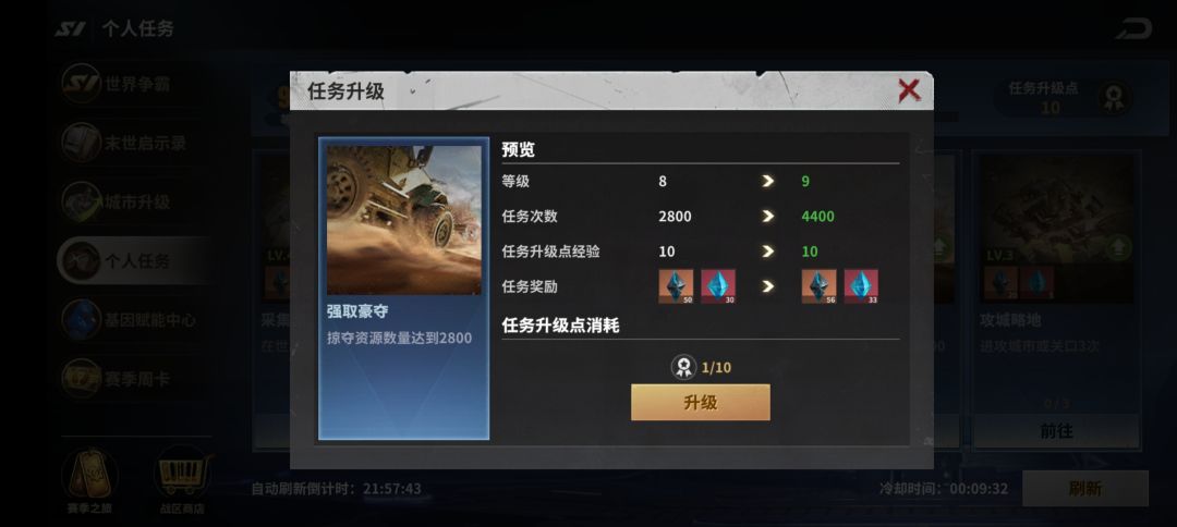 ①采集资源。这个任务1级就需要1000资源(不论种类),如果不提前卡点采集,要么来不及完成,要么耽误刷新。本人当初就手快点了几下,大家看图就知道后果了。所以建议不要升级,如果雷达任务中刷出来采集任务(有速度加成),那就预留下来,刷出这个任务的时候用,刷不出就直接放弃这个任务。