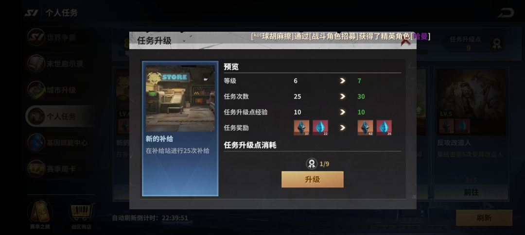 个人任务会消耗车队耐久、加速道具等大量资源,这样的话就与联盟对决有所冲突,但鱼和熊掌不可兼得,本人认为还是集中精力,利用3周左右的时间把基因片段升满,再专心完成联盟对决比较划算。